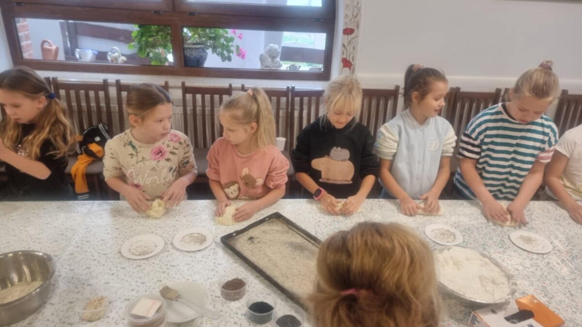 7 listopada 2024 r. uczniowie klas 2a i 2c uczestniczyli w warsztatach pieczenia chleba i bułek w Chlebowej Chacie w