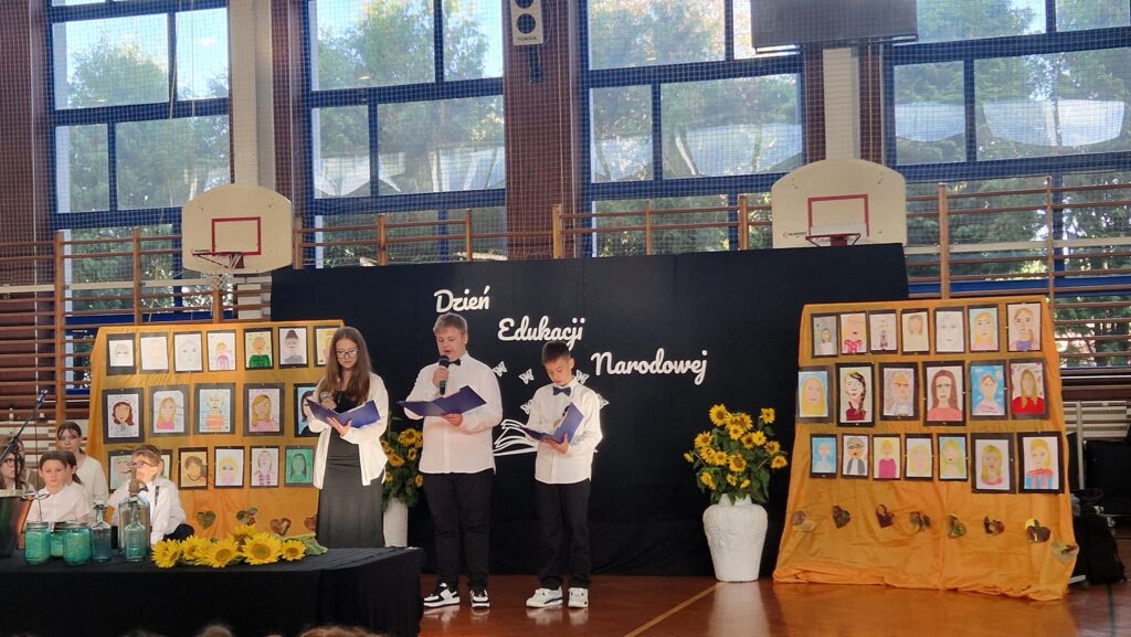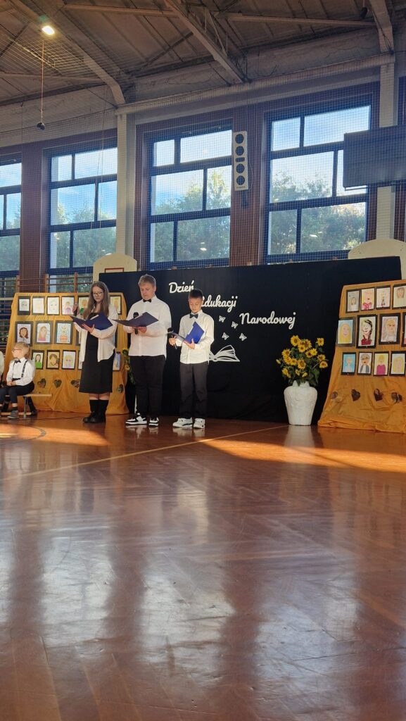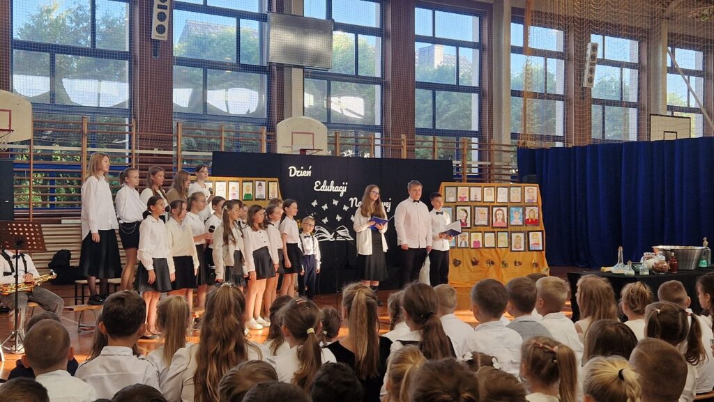 Podczas uroczystej akademii uczniowie klas 8A i 8B, wraz ze szkolnym chórem, złożyli życzenia oraz podziękowania nauczycielom i wszystkim pracownikom szkoły. W uroczystości wziął udział Burmistrz Gminy i Miasta Odolanów, Pan Marcin Szorski, a także przedstawiciele Rady Rodziców, którzy również przekazali życzenia całej szkolnej społeczności.