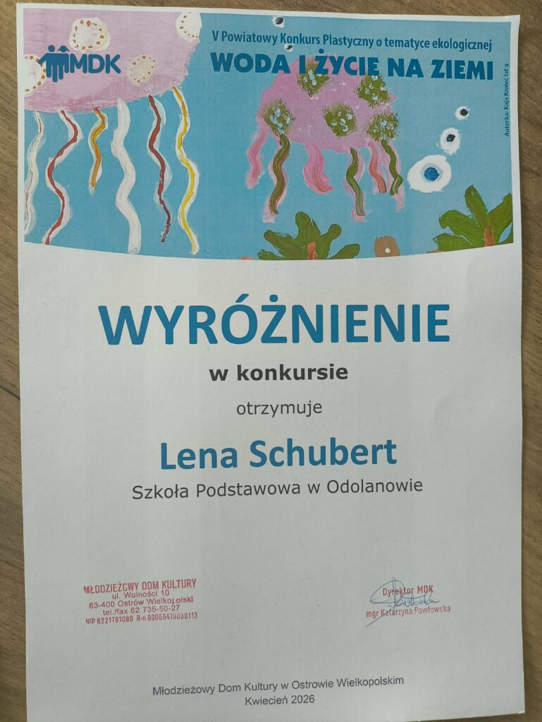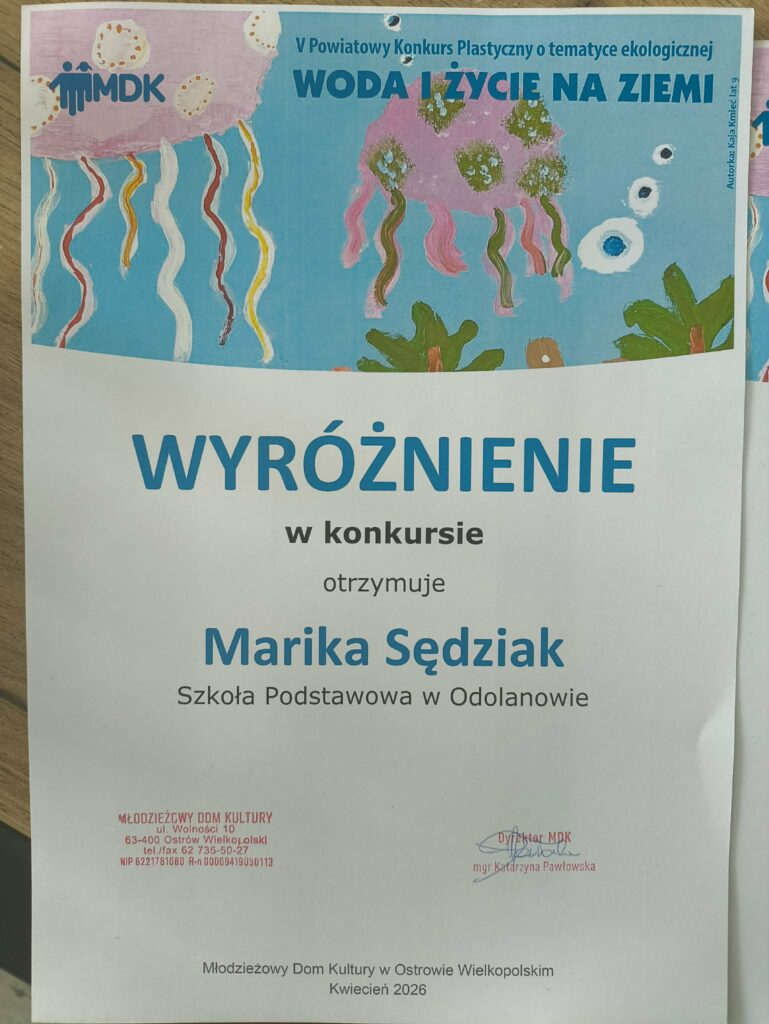 Marika Sędziak i Lena Schubert otrzymały wyróżnienie w V Powiatowym Konkursie Plastycznym WODA I ŻYCIE NA ZIEMI organizowanym przez Młodzieży Dom Kultury w Ostrowie Wielkopolskim.