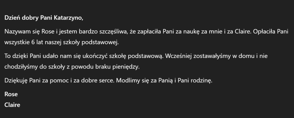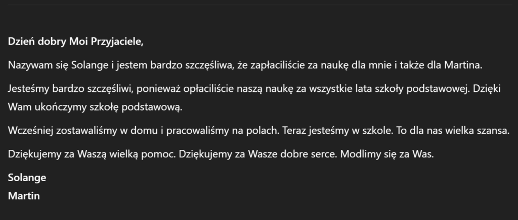 W imieniu własnym oraz podopiecznych z wioski Wom-Yoanda serdecznie dziękuję za otwarte serca i wszystkie wpłaty. Zebrane pieniądze umożliwią kontynuację nauki w nowym roku szkolnym około 17 dzieciom.