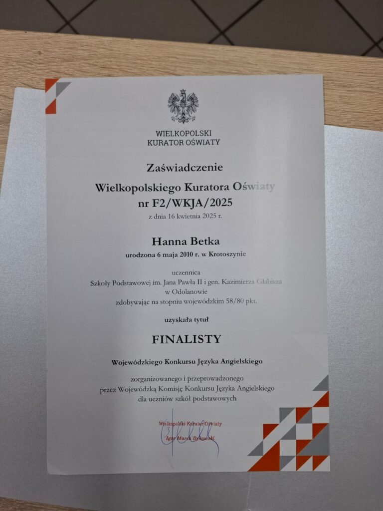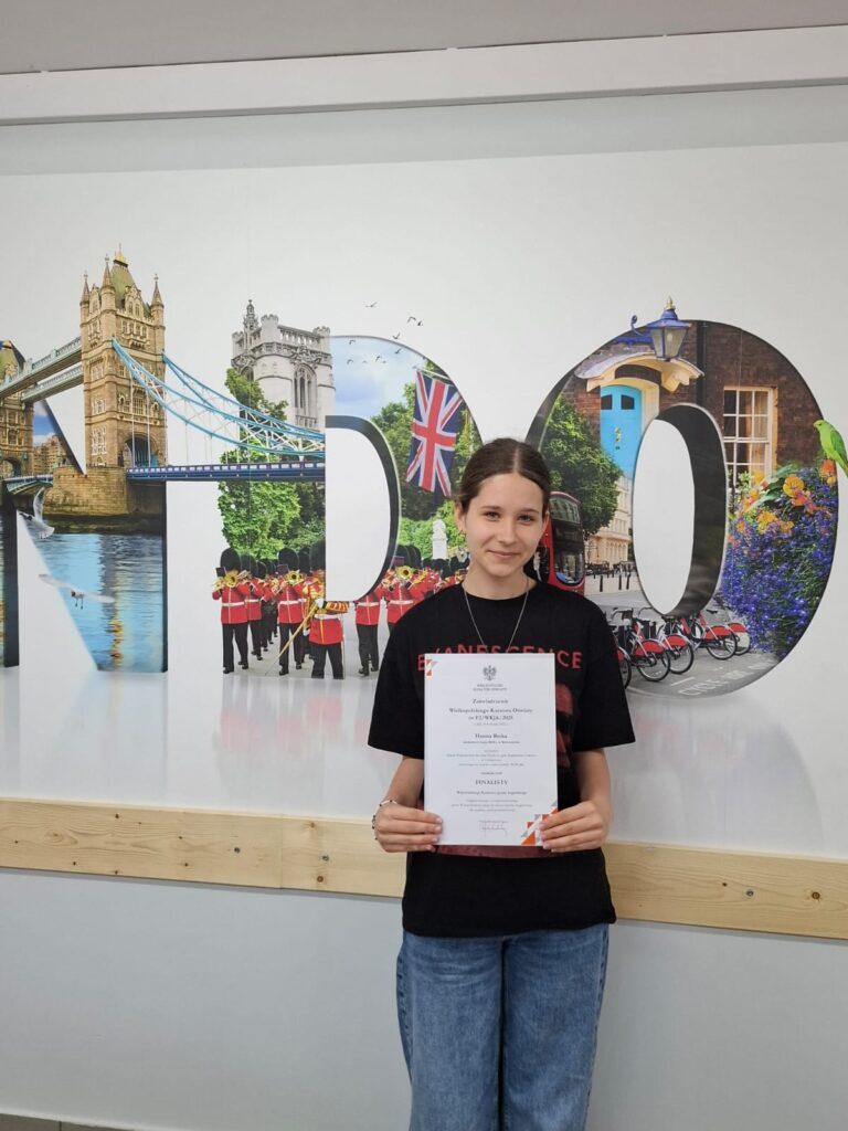 Z radością informujemy, że Hanna Betka, uczennica klasy 8c, wzięła udział w najwyższym etapie Wojewódzkiego Konkursu Języka Angielskiego i uzyskała tytuł Finalistki!