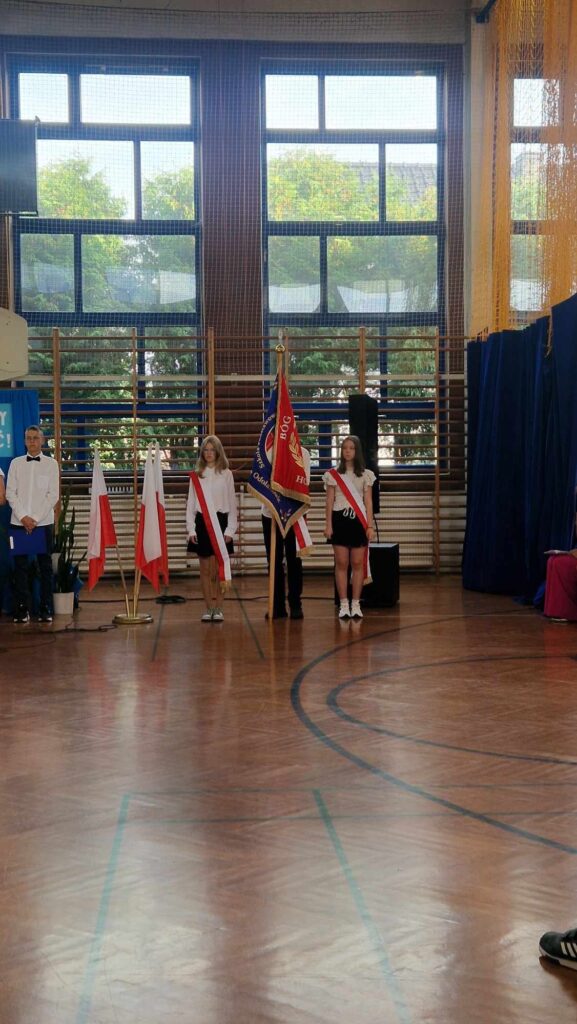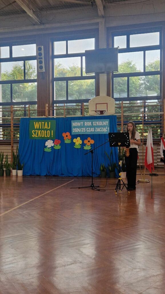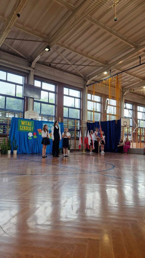 Pani Dyrektor Renata Fertun serdecznie powitała wszystkich uczniów, rodziców, przybyłych gości oraz grono pedagogiczne. Życzyła wszystkim wielu sukcesów, wytrwałości w realizacji celów oraz powodzenia w zdobywaniu wiedzy i umiejętności. Klasa 8b przygotowała część artystyczną, w której pożegnano wakacje i przyjęto pierwszoklasistów w progi naszej szkoły. Jednocześnie odbyło się ślubowanie – reprezentanci klas pierwszych wraz z wychowawcami złożyli tekst przysięgi na sztandar szkoły. Rok szkolny 2024/2025 został uroczyście otwarty – powodzenia!