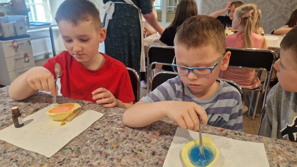 Dzieci wzięły udział w wielkanocnych warsztatach mydlarskich oraz tworzenia lizaków, odkryły tajemnice Pałacyku, a na zakończenie zmierzyły się z wyzwaniami na świeżym powietrzu, szukając koszyczka wielkanocnego.