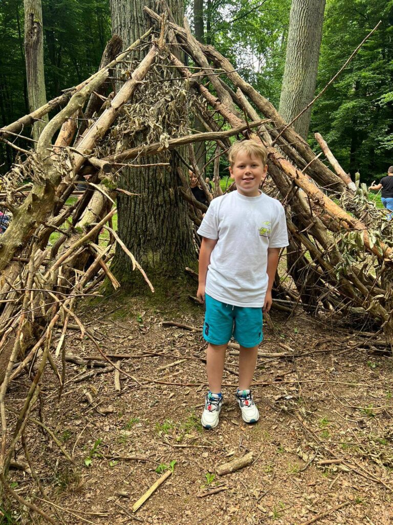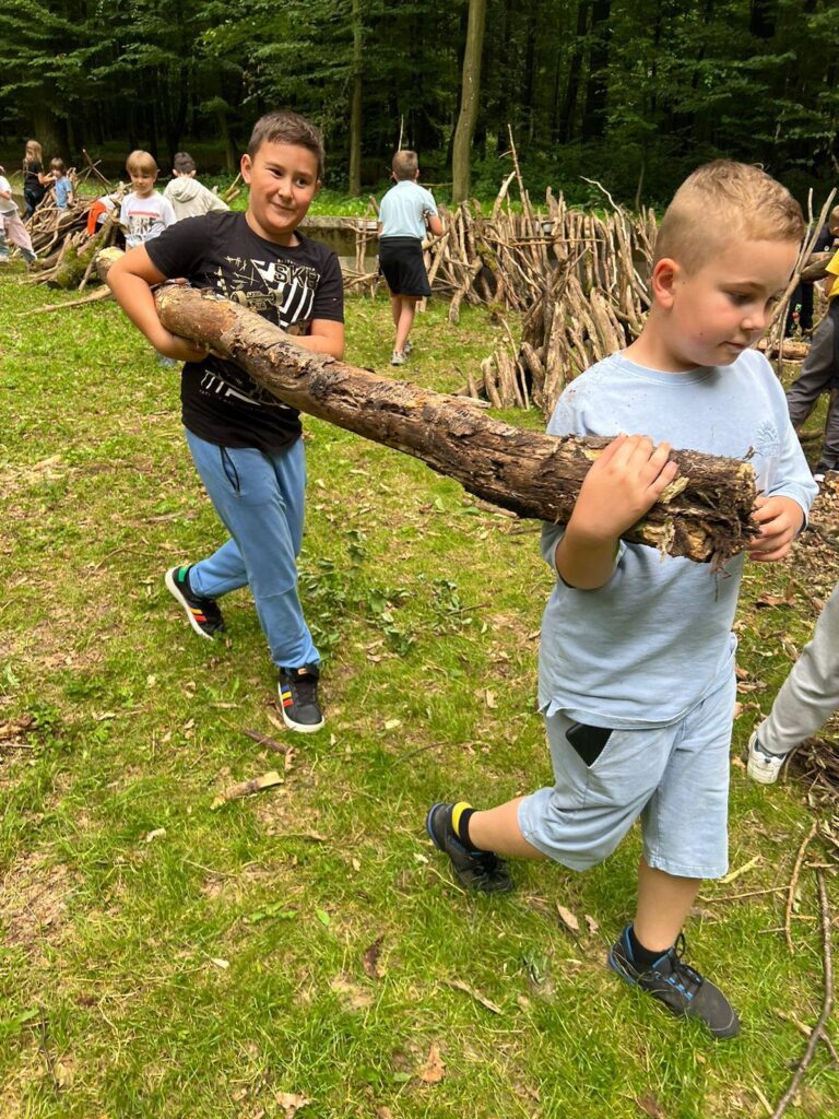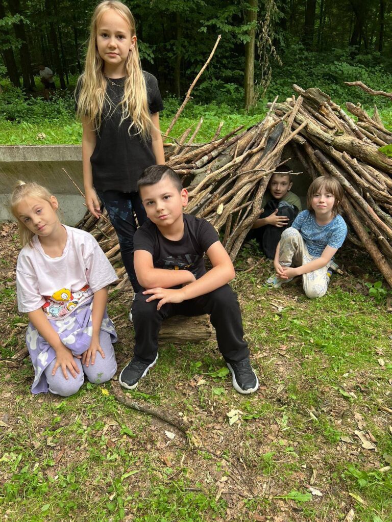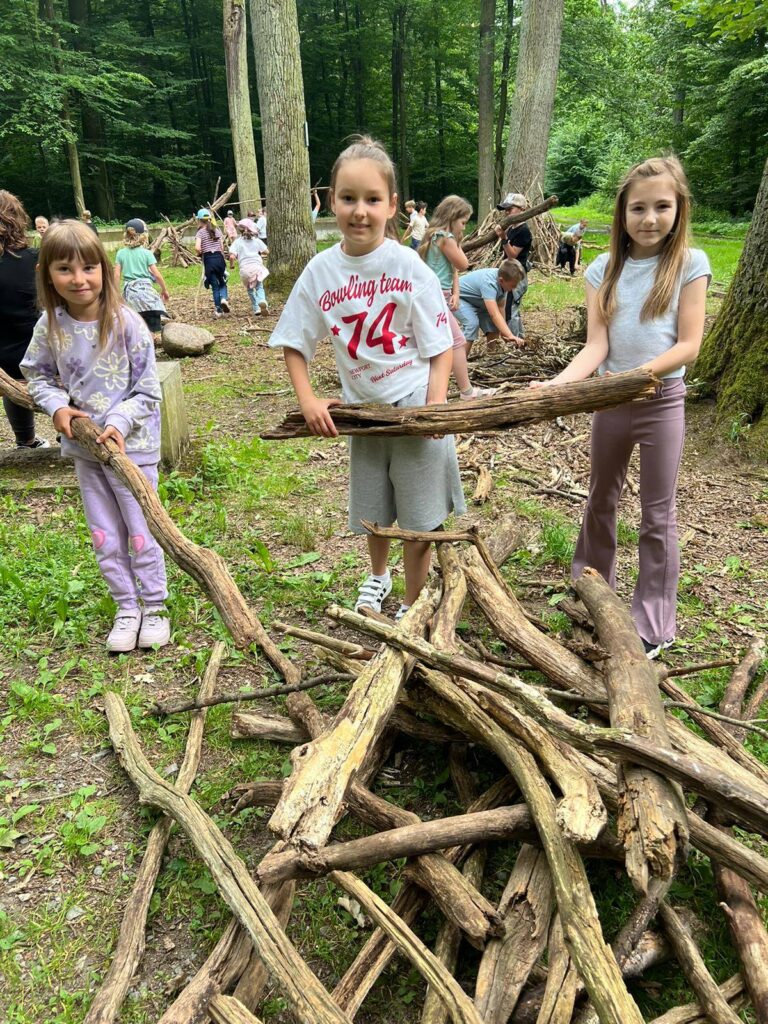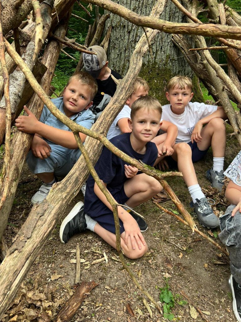 Było kreatywnie i edukacyjnie – dzieci budowały własne szałasy, poznawały gatunki drzew i ich szyszki. Stara wyłuszczarnia nasion zrobiła ogromne wrażenie.